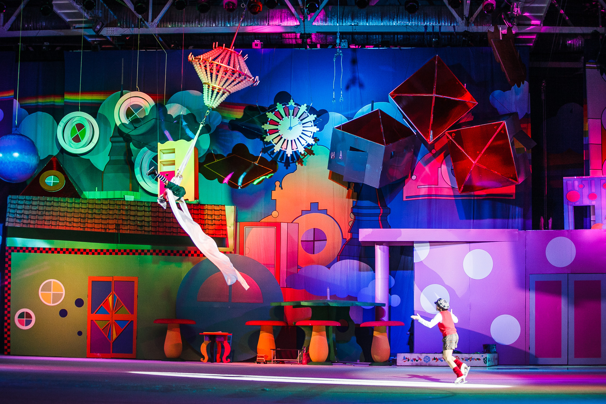 Лед арены превращался в огромный экран, на который проецировались изображения. В постановке задействованы маленькие спортсмены из детских школ фигурного катания. В роли Карлсона выступает Алексей Ягудин, выполняющий не только мастерское катание, но и полеты в воздухе, в роли мамы малыша - Елена Бережная, олимпийская чемпионка и художественный руководитель Детского ледового театра. Фрекен Бок - чемпион мира по парному катанию Алексей Тихонов. В роли Малыша – его верный партнер на льду и в жизни Мария Петрова.
