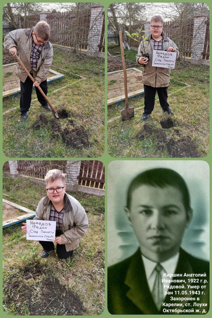Великая Отечественная война не обошла стороной ни одну семью на территории бывшего СССР. Погибли 27 миллионов человек. В годовщину 75-летия Победы Всероссийское добровольческое движение «Волонтёры Победы» и Фонд памяти полководцев Победы выступили с инициативой — создать каждому из погибших живой памятник, высадив 27 миллионов деревьев по всей стране. «Сад памяти» — это место, где можно передать историю своей семьи детям и внукам. Это не просто акция, а начало новой традиции. Обучающиеся, родители и педагоги МКОУ "Ушакинская СОШ" №1"  тоже приняли приняли участие в акции "Сад Памяти". Обучающиеся школы и родители высадили деревья на своих участках, а некоторые из них нарисовали дерево, которое обязательно посадят позже, и посвятили их родственникам, участникам Великой Отечественной войны. Педагоги школы  высадили на пришкольном участке плодовые деревья и кустарники в память о ветеранах, отдавших свои жизни и приблизивших Великую Победу.