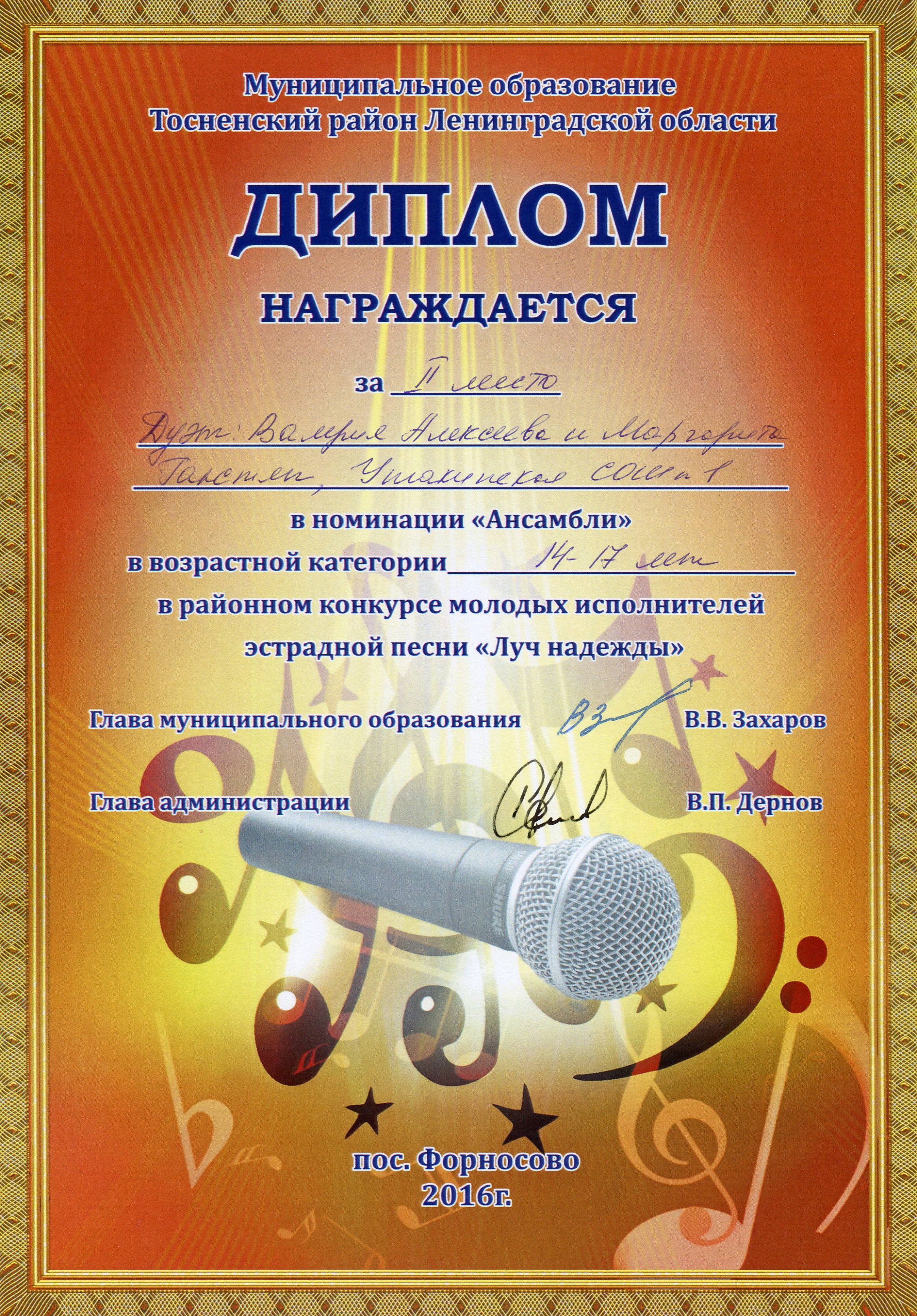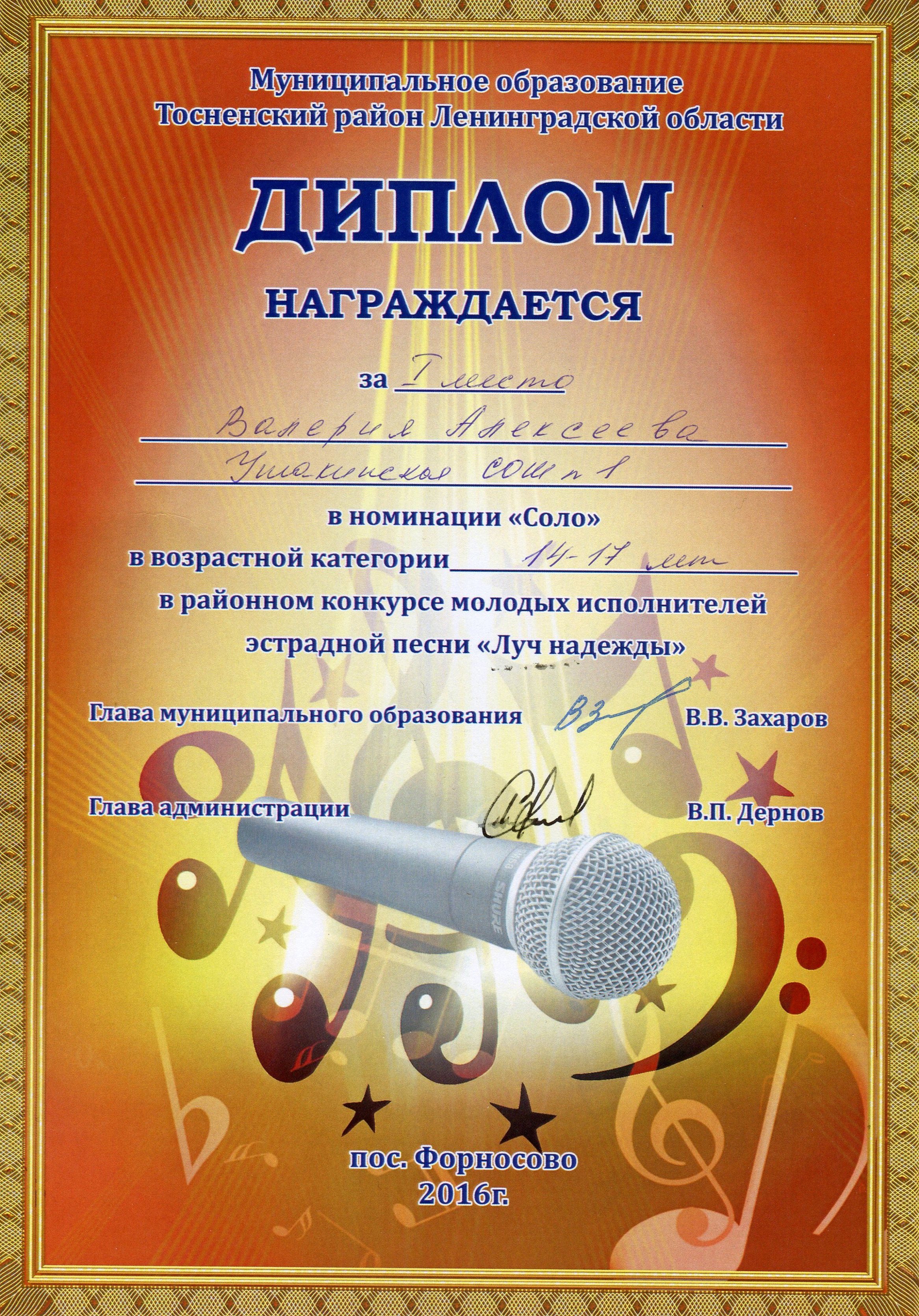 3 декабря 2016 года в районном конкурсе молодых исполнителей эстрадной песни «Луч надежды», который проходил в пос. Форносово, в номинации «Соло» Алексеева Валерия, обучающаяся 9 класса, заняла I место, Галстян Маргарита, обучающаяся 8 класса, заняла III место.